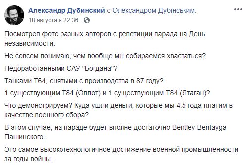 Журналист Александр Дубинский говорит о том, что техника для парада — морально устарела. «Посмотрел фото разных авторов с репетиции парада на День независимости. Не совсем понимаю, чем вообще мы собираемся хвастаться? Недоработанными САУ «Богдана»? Танками Т64, снятыми с производства в 87 году? 1 существующим Т84 (Оплот) и 1 существующим Т84 (Ятаган)?