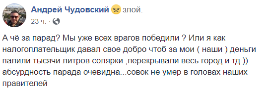 «А чё за парад? Мы уже всех врагов победили ? Или я как налогоплательщик давал свое добро чтоб за мои ( наши ) деньги палили тысячи литров солярки ,перекрывали весь город и тд. Абсурдность парада очевидна…совок не умер в головах наших правителей», — пишет киевский предприниматель Андрей Чудовский.