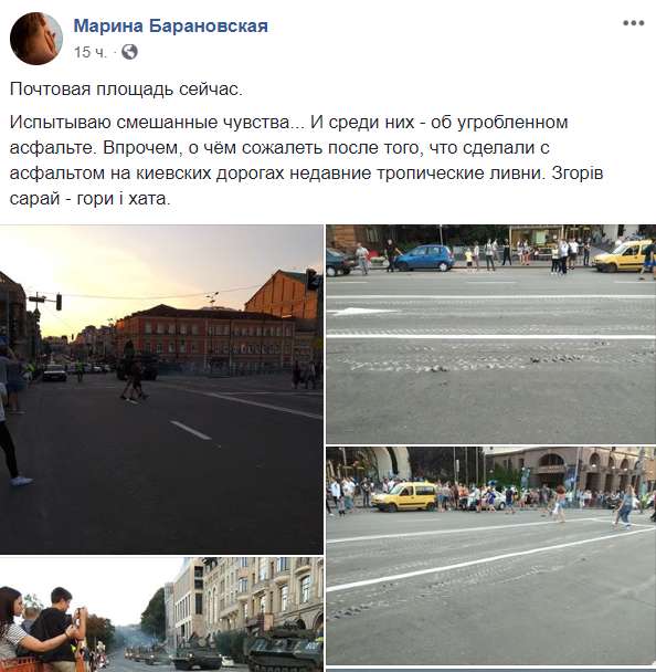 Журналист Денис Попович решил потролить тех, кто жалуется на сломанный асфальт. Он переиначил известное стихотворение Ивана Франко в связи с грядущим парадом: «Посвящается соотечественникам, которых беспокоит состояние асфальтового покрытия на Крещатике, после прохождения военной техники по случаю Дня Независимости.