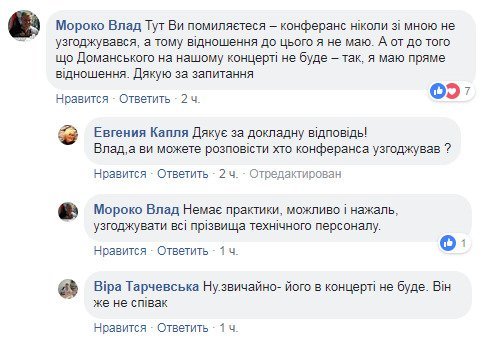 Также отстранение Доманского подтвердил директор департамента культуры Запорожской областной госадминистрации Владислав Мороко. "К тому, что Доманского на нашем концерте не будет, я имею прямое отношение", — написал Мороко в сети в ответ на претензии активистов в Facebook.