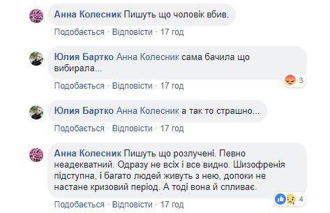"Убийца ее муж. Соседка видела, как он сделал два выстрела в спину, один в голову. Это мне только что сказали, его уже задержали", - написала в комментарии к посту в одной из винницких групп Светлана Билоконь.