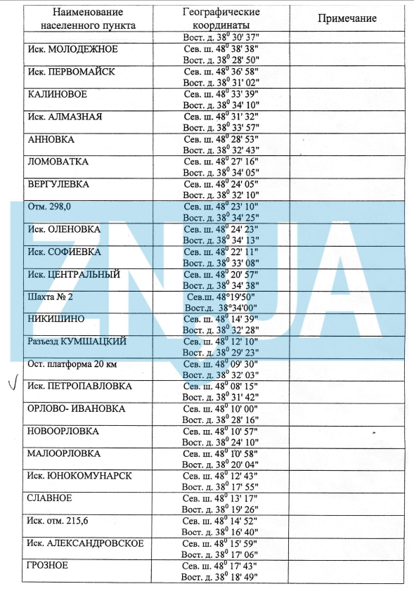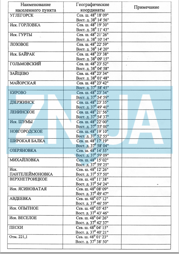 Об этом свидетельствует приложение к Минскому меморандуму о линии столкновения с привязкой к местности, передает Joinfo.ua ссылаясь на украинские СМИ. Так, этот документ также содержит таблицу, в которую входит перечень населенных пунктов. Через них должна проходить линия разграничения. Таблица включает перечень точных географических координат.