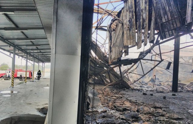 На видео видно, что от здания остались одни стены — большая часть крыши склада обвалилось. Утром остатки склада еще дымились.