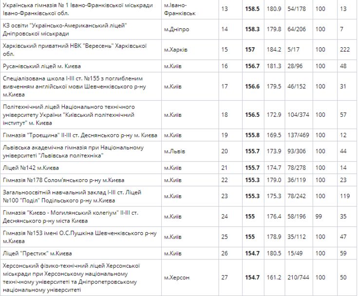 Рейтинг составлялся на основании среднего значения баллов участников тестирования по всем предметам ВНО.