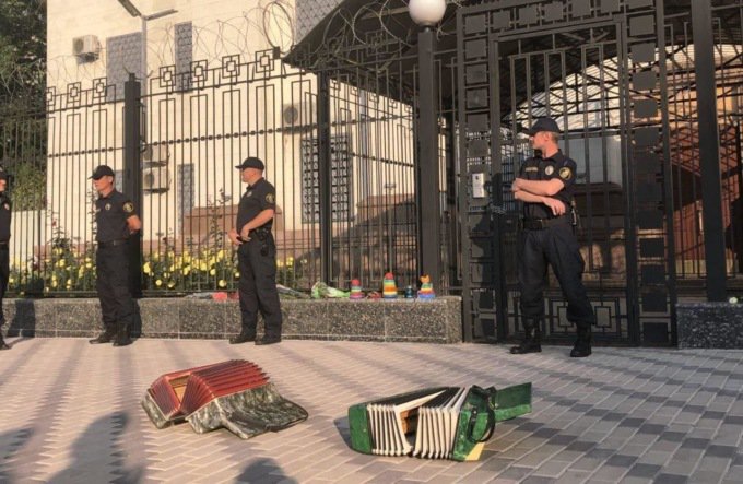 В Киеве помянули Кобзона пирамидками и порванным баяном у здания посольства РФ