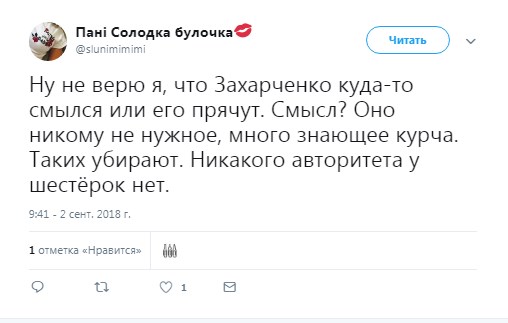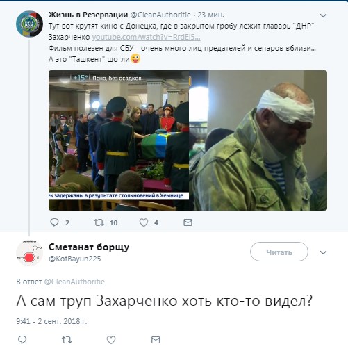 Кроме того, на волне новостей о резонансном убийстве главаря боевиков «ДНР» Александра Захарченко начинают появляться новые версии того, что произошло 31 августа в донецком кафе «Сепар». Так, украинский дипломат Василий Филипчук обратил внимание на то, что вся ситуация с убийством Захарченко подозрительно напоминает сцену из фильма.