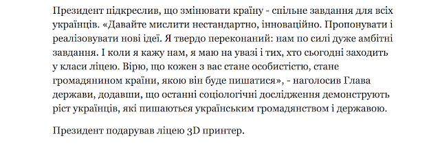 «Президент подарував нашому ліцею "Наукова зміна" 3d принтер. Не критикуватиму лінійку», — зокрема, написала у Фейсбуку журналістка Валентина Клименко.