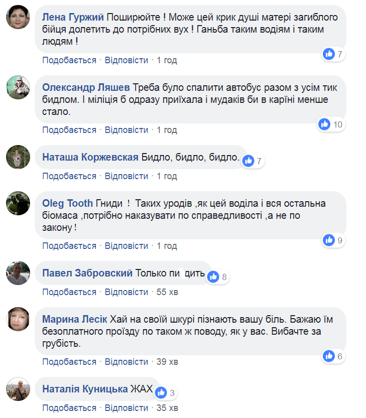 "Может, этот крик души матери погибшего бойца долетит до нужных ушей! Позор таким водителям и таким людям!", "Надо было сжечь автобус вместе со всем тем быдлом. И полиция бы сразу приехала, и мудаков бы в стране меньше стало", "Быдло, быдло, быдло", "Гниды! Таких уродов, как этот водила и вся остальных биомасса, нужно наказывать по справeдливости, а нe по закону!", "Только пи*дить", "Пусть на своей шкуре почувствуют вашу боль. Желаю им бесплатного проезда по таком же поводу, как у вас. Извините за грубость", "Ужас", "Ублюдков у нас хватает", "Долой сепаров!" — пишут возмущенные пользователи.