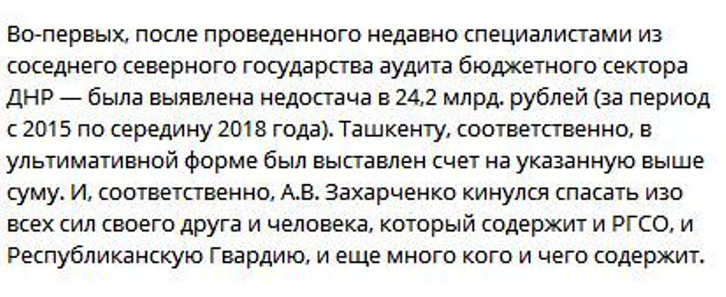 Тelegram-канал «Оппозиция ДНР» сообщает, что так называемый «министр доходов и сборов» Александр Тимофеев «Ташкент» причастен к убийству главаря «ДНР» Александра Захарченко