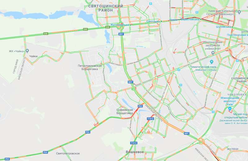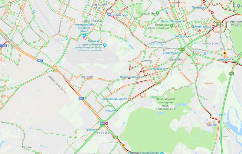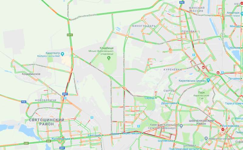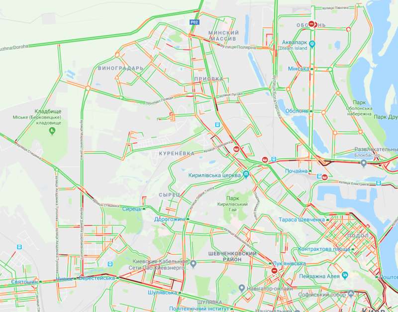 Движение по Набережному шоссе практически заблокировано. Также серьезные пробки на ул. Большая Житомирская, на некоторых участках ул. Борщаговская и проспекта Победы, на бульварах Леси Украинки и Тараса Шевченко, проспекте Валерия Лобановского, проспекте Степана Бандеры и Владимирском спуске, на ул. Саксаганского.