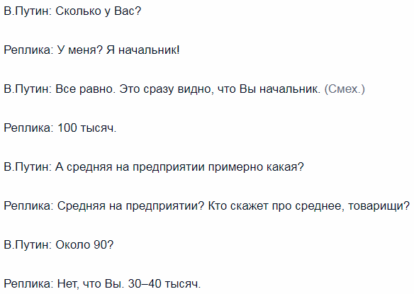 Когда же Путин спросил о размере средней зарплаты ("А средняя на предприятии примерно какая? Около 90?"), ему назвали совсем другую сумму. "Нет, что вы. 30-40 тысяч", - сказала начальница.