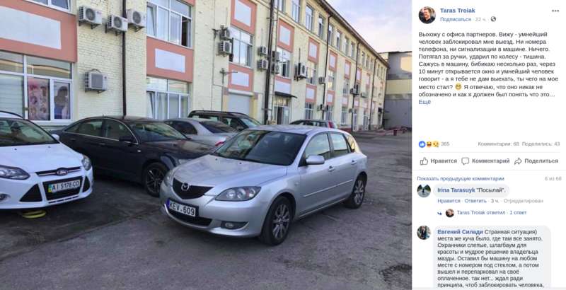 «Выхожу с офиса партнеров. Вижу — умнейший человек заблокировал мне выезд. Ни номера телефона, ни сигнализации в машине. Ничего. Потягал за ручки, ударил по колесу — тишина. Сажусь в машину, бибикаю несколько раз, через 10 минут открывается окно и умнейший человек говорит — а я тебе не дам выехать, ты чего на мое место стал? Я отвечаю, что оно никак не обозначено, и как я должен был понять, что это место столь пииип уважаемого человека?
