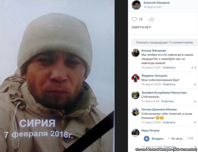 Тот факт, что траурные посты Алексея Макарова и Зарины Макаровой были опубликованы лишь спустя 2 с лишним месяца после боя под Дейр-эз-Зором, не удивителен: многие родственники погибших в этом бою "вагнеровцев", по их словам, получали гробы лишь спустя длительное время. Как утверждал в интервью Радио Свобода руководитель аппарата СБУ Игорь Гуськов, доставка тел погибших в Сирию была приостановлена незадолго до президентских выборов в России, состоявшихся 18 марта. Интересно, что соболезнования родным Макарова в комментариях к этому посту выражает Людмила Апостол – мать еще одного погибшего в бою 7 февраля, гражданина России и Молдавии Владислава Апостола. В переписке с Радио Свобода неделю назад она подтвердила, что ее сын погиб в Сирии.