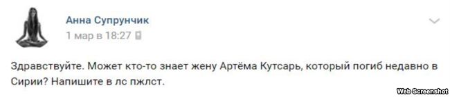 Сразу после публикации новых 9 имен и фамилий из "списка СБУ" Радио Свобода удалось найти лишь обрывочную информацию об упомянутом в нем жителе села Макковеевское Читинской области Артеме Кутсаре (на момент гибели ему было 34 года). Известно, что Кутсарь воевал в Чечне, работал в такси. О его смерти в Сирии 1 марта 2018 года написала его знакомая (оригинал поста, сохраненная копия):