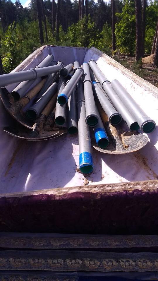 На крышках гробов видны отверстия. Также в одном из гробов лежат пластиковые трубы с лопатами.