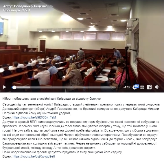 К всеобщему удивлению, Негрич не захотел раздувать скандал и заявил, что все ошиблись – Герасименко только толкнул его, но не бил. Более того, потасовку Николай Михайлович перевел в политическую плоскость. Депутат заявил, что первым видео драки в сеть выложил Владимир Тищенко, который «является не просто активистом, но и членом комитета киевской городской организации Всеукраинского объединения «Свобода».
