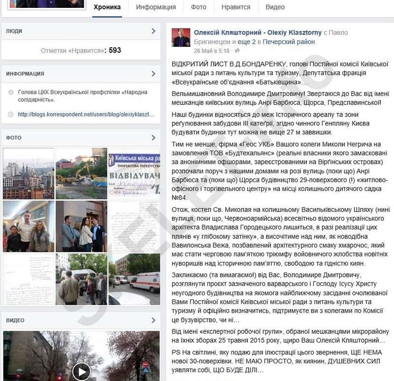 «Наши дома относятся к границам исторического ареала и зоны регулированию застройки III категории, согласно действующему Генплану Киева строить дома здесь можно не выше 27 м. высотой. Тем не менее, фирма «Геос УКС» Николая Негрича по заказу ООО «Будтехальянс» (реальные владельцы которого замаскированные по анонимным оффшорами, зарегистрированными на Виргинских островах) начали рядом с нашими домами на углу улиц Анри Барбюса и Щорса строительство 29-этажного (!) «жилищно-офисного и торгового центра» на месте бывшего детского сада №84”,- сообщил Кляшторный.
