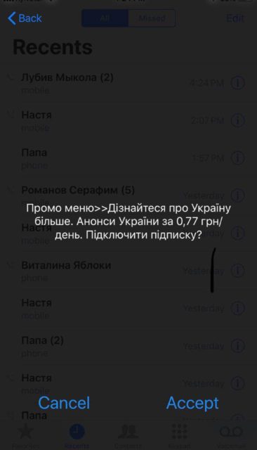 «Если вы никогда не сталкивались с кидаловом от сотовых операторов, то я покажу вам как это выглядит на примере лидера украинского рынка компании Kyivstar. Буквально 10 минут назад говорил по телефону. Положил трубку. Как случайно смотрю на экран — какое-то системное сообщение с кнопкой «Принять» прямо под моим пальцем большой руки», — отметил он.
