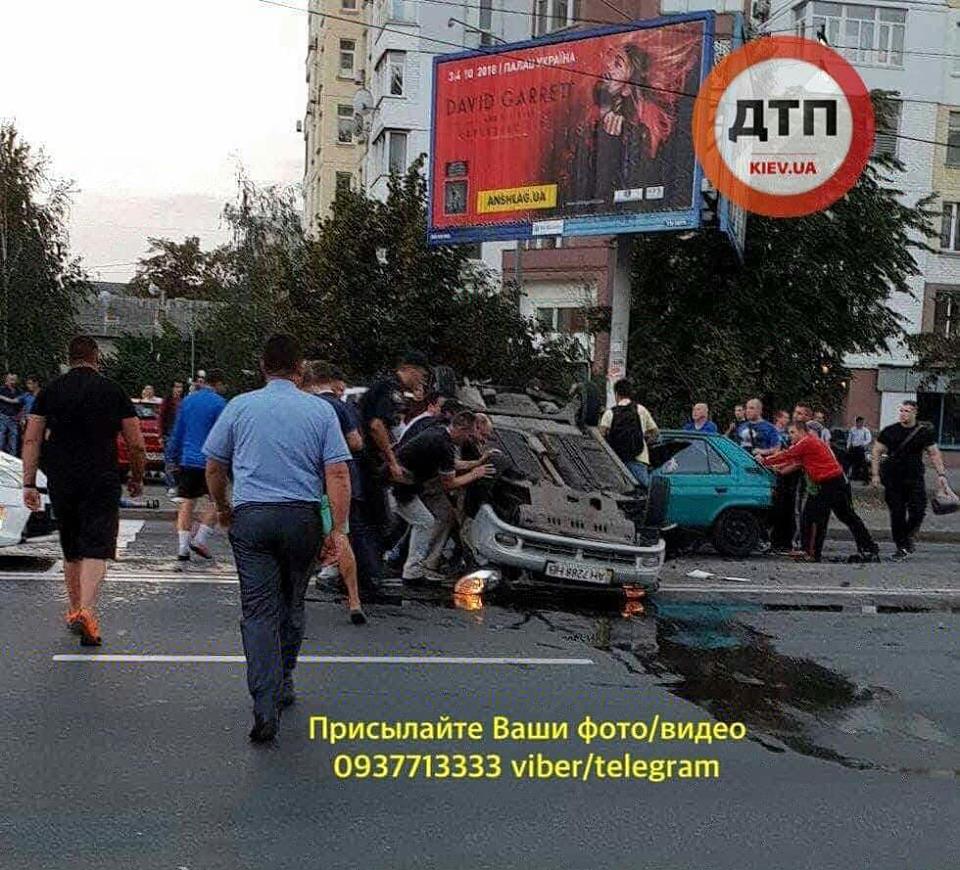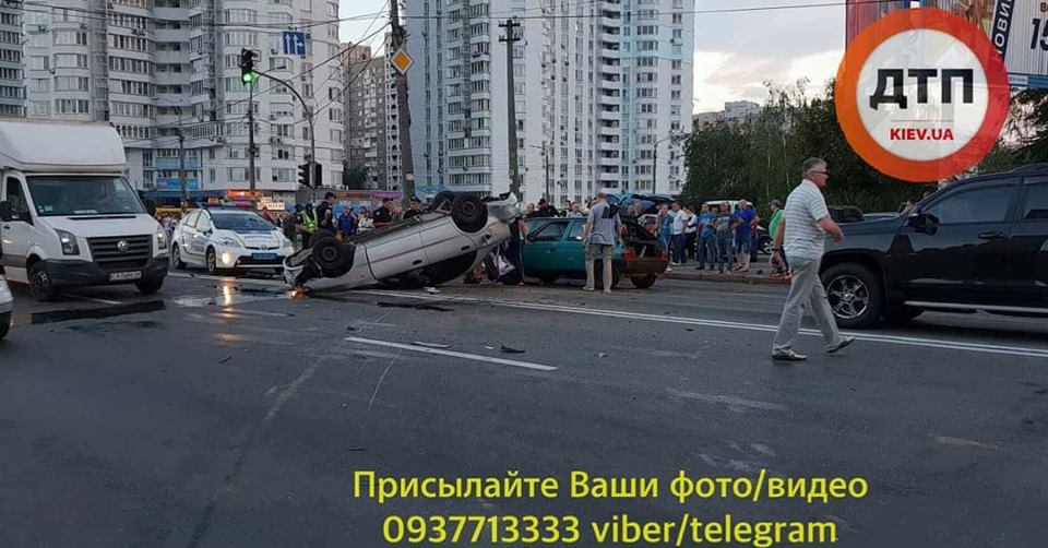 В Киеве водитель Daewoo Lanos в неадекватном состоянии, убегая от полиции, влетел в четыре авто и перевернулся.