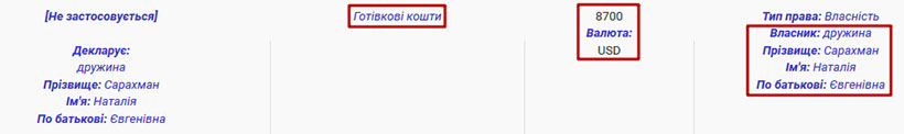 Незважаючи на низькі доходи та покупку елітного автомобіля, саме Наталія Євгеніївна задекларувала 8700 у. о. заощаджень. Їх пані Наталія зберігає готівкою.