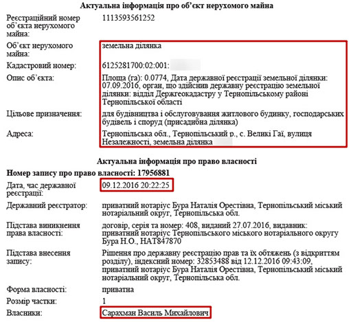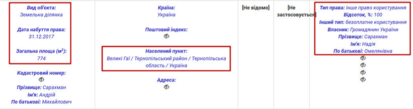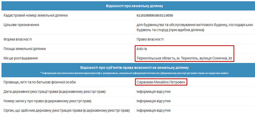 Ми також проаналізували майно найближчих родичів прокурора. Вище згаданий батько прокурора Михайло Петрович Сарахман має у своїй власності будинок площею 265 кв. м. та три земельні ділянки під ним. Це житло 62-річного Михайла Петровича розташоване в самому Тернополі, по вулиці Сонячній. До речі, одну із земельних ділянок він орендує у Тернопільської міськради за " 0,99 грн. Щомісячно". У відкритих реєстрах та аналітичній системі YouControl нам теж не вдалося знайти жодного бізнесу Михайла Сарахмана, тож звідки кошти на це майно – невідомо.