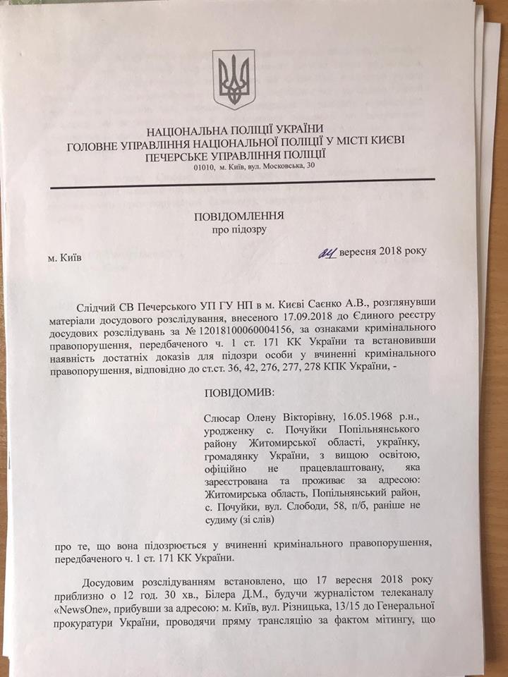 Нападавшей на журналистку NewsOne предъявили подозрение. Документ
