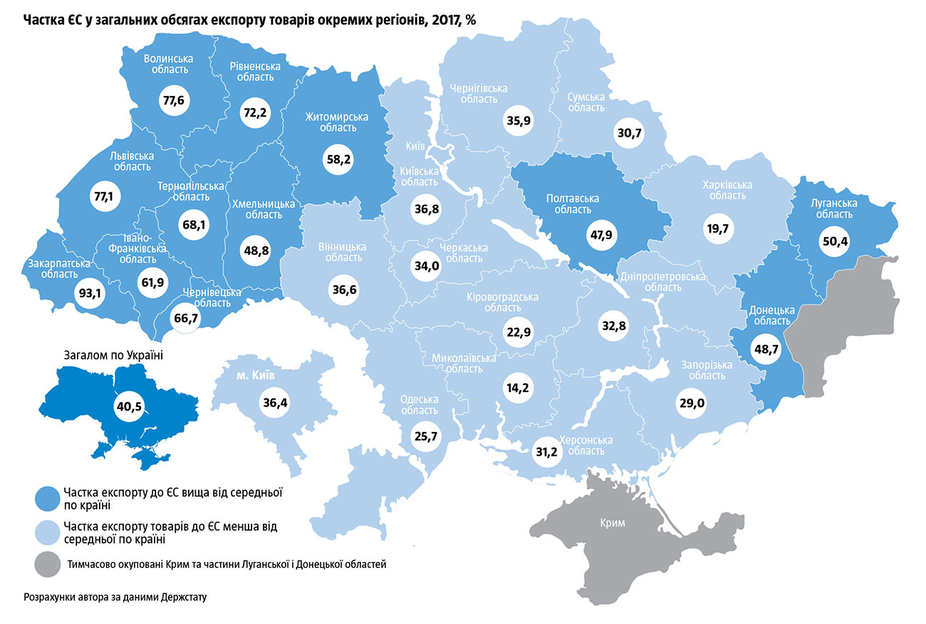 Между тем реальная динамика двусторонней торговли с ЕС в последние годы и особенно темпы роста продаж в страны Евросоюза свидетельствуют об обратном. Экспорт в ЕС достиг рекордных за все годы существования Украины объемов уже в прошлом году, в 2017-м, когда превысил €15,5 млрд. И далее динамично растет: за восемь месяцев 2018 года, по оперативным данным ГФС, он вырос на 18,6%. А его доля в общем украинском экспорте - с 40% до 42,1%. В 12 из 25 подконтрольных Украине регионов доля экспорта в ЕС составляет от 50% до 90%. Причем среди них не только традиционно евроориентированные западные области, но и Донецкая, и Луганская области, где доля экспорта в ЕС так же достигает 50% всего вывоза и выше, чем в ряде регионов Центральной Украины.