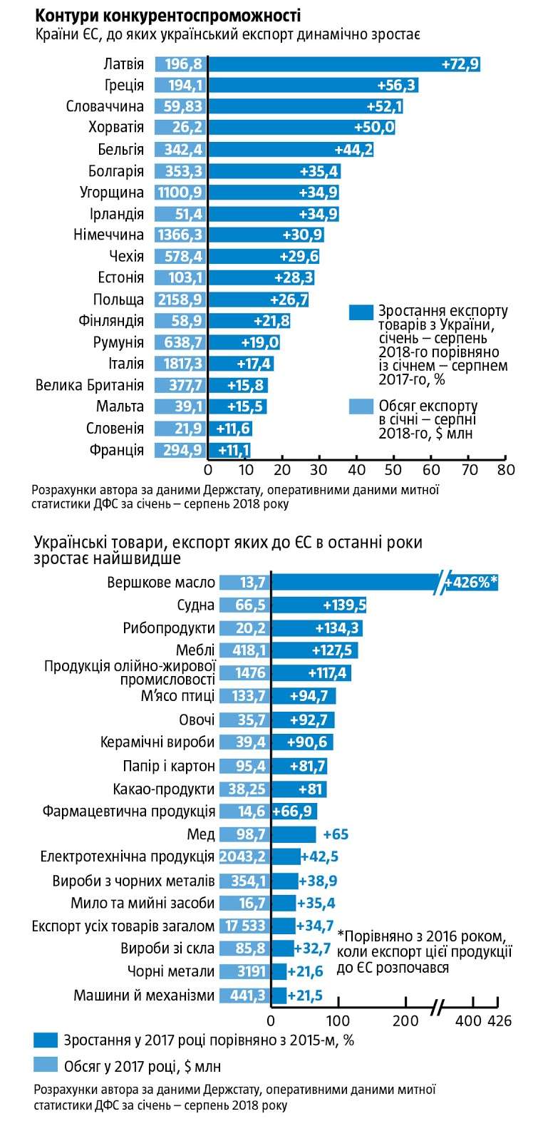 Несмотря на скандально известные публичные жалобы на низкие квоты со стороны «куриного» олигарха Косюка, экспорт украинского мяса птицы в ЕС вырос за два года на 94%. И в 2017-м рынок Евросоюза обеспечил 34,3% всей экспортной выручки украинских производителей курятины ($133,7 млн). С 2016 года начался и стремительно набирает обороты экспорт в ЕС сливочного масла из Украины. Если в первый год поставки его туда было реализовано на $2,6 млн, то в 2017-м - уже на $13,7 млн, а за первое полугодие 2018-го - $7,6 млн. Хотя еще совсем недавно могло казаться, что чего-чего, а украинских молокопродуктов на европейском рынке точно не ждут. Почти в 2,2 раза вырос с 2015 по 2017 год экспорт в ЕС готового украинского масла и других жиров (до $1,48 млрд).