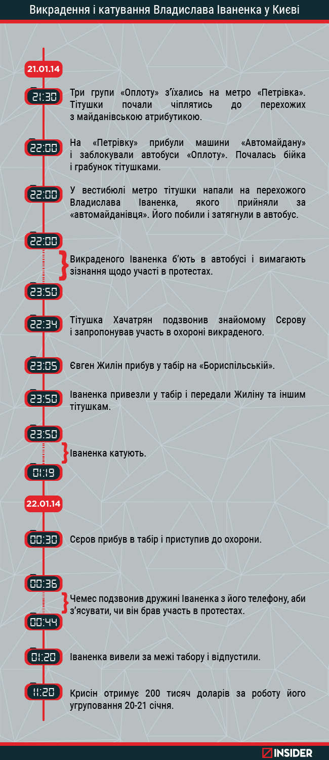 Похищенного Иваненко посадили на заднее сиденье автобуса, по бокам его удерживали титушки Фатуллаев и Тагиров. Они, а также Рагимов и Харченко, били его в течение почти двух часов, требуя от него признание, что он участвовал в протестах на Майдане.