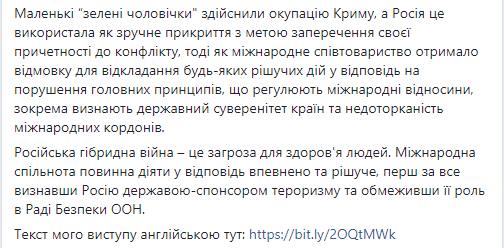 "Украина сейчас чувствует всю полноту гибридной войны России на себе, в том числе и в сфере здравоохранения", - резюмировала она.