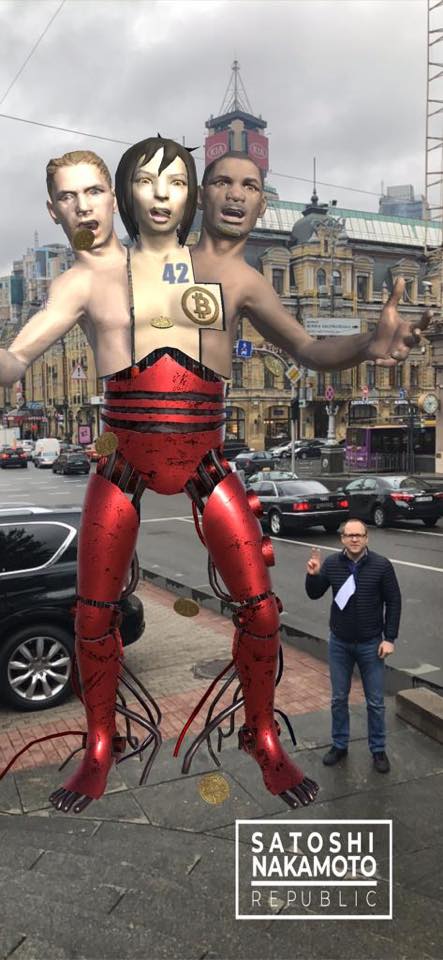 По его словам, памятник посвящен создателю Биткоина Сатоши Накамото. Увидеть трехглавый монумент могут только те, кто скачал специальное приложение себе на телефон. Отмечается, что Сатоши Накамото является виртуальной персоной, которую никто не видел, однако художники создали его 3D-образ.