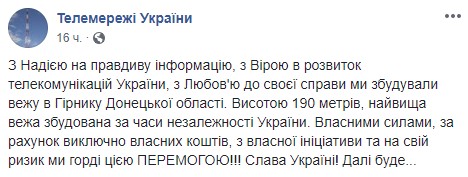 "С надеждой на правдивую информацию, с верой в развитие телекоммуникаций Украины, с любовью к своему делу мы построили телевышку в Горняке Донецкой области. Высотой 190 метров, это самая высокая вышка, построенная за время независимости Украины" – сообщают в компании.