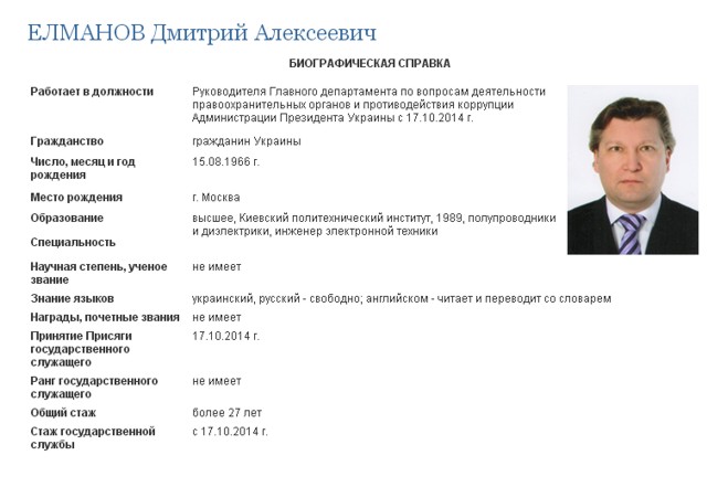 На сайте офиса главы государства не сложно выяснить, что такие фамилии соответственно у руководителя Главного департамента по вопросам деятельности правоохранительных органов и противодействия коррупции АП (Дмитрий Елманов) и руководителя Главного департамента по вопросам национальной безопасности и обороны АП (Евгений Добряк).