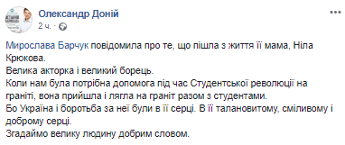 "Мирослава Барчук сообщила о том, что ушла из жизни ее мама, Нила Крюкова. Великая актриса и великий борец. Когда нам была нужна помощь во время Студенческой революции на граните, она пришла и легла на гранит вместе со студентами. Потому что Украина и борьба за нее были в ее сердце. В ее талантливом, смелом и добром сердце. Вспомним великого человека добрым словом ", - написал Доний.
