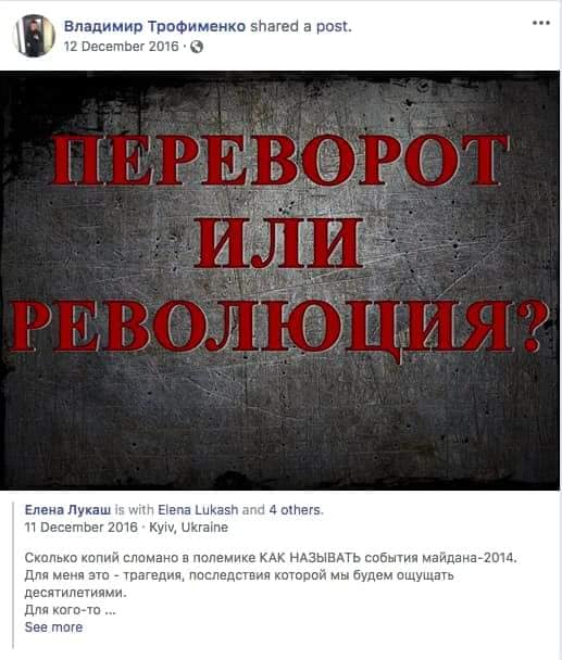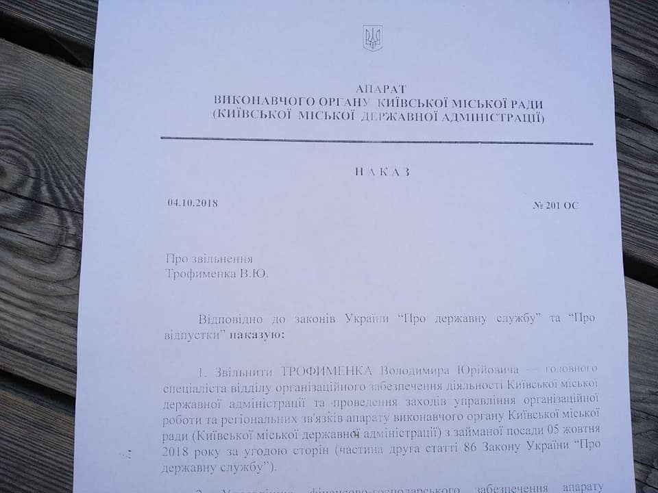 Главный специалист одного из отделов Киевской государственной администрации Владимир Трофименко уволен по требованию активистов группировки С14, которые обнаружили страницу чиновника в социальной сети, где тот выступал за «русский мир».