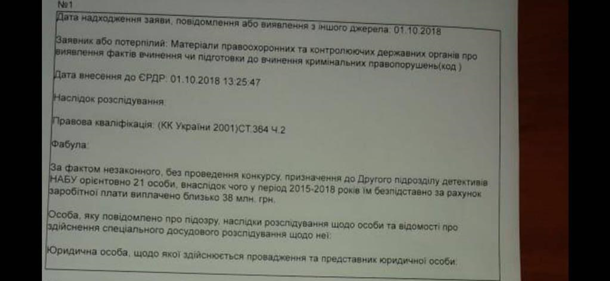 Таким чином, працевлаштувавши в НАБУ цілий підрозділ невідомо як набраних на роботу людей, з порушенням вимог Закону і власного Порядку прийому на роботу, керівництво НАБУ вчинило дії, які містять ознаки злочину, передбаченого ч.2 ст.364 Кримінального кодексу України - «Зловживання владою або службовим становищем». На даний момент відкрито кримінальне провадження «за фактом незаконного, без проведення конкурсу, призначення до Другого підрозділу детективів НАБУ орієнтовно 21 особи, внаслідок чого у період 2015-2018 років їм безпідставно за рахунок заробітної плати виплачено близько 38 млн. грн».
