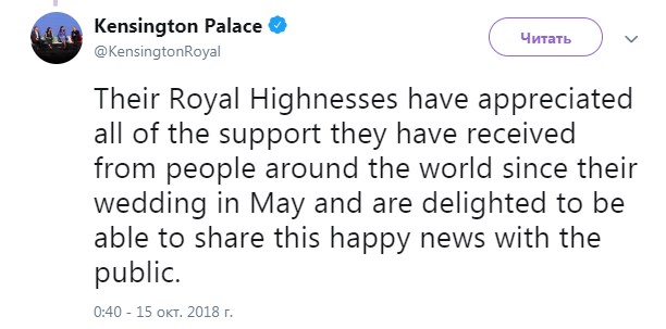 "Очень рады объявить, что Герцогиня Сассекская ожидает ребенка весной 2019 года. Их Королевские Высочества высоко оценили всю поддержку, которую они получили от людей во всем мире со времени их свадьбы в мае, и рады, что смогли поделиться этой счастливой новостью с публикой", – говорится в сообщении.