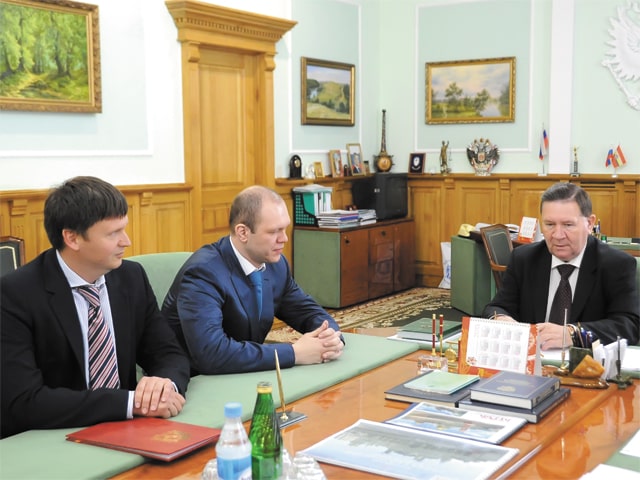 Деловые переговоры Дмитрия Никитина, Дениса Дзензерского и курского губернатора Александра Михайлова (слева направо). Курск, 2013 год.