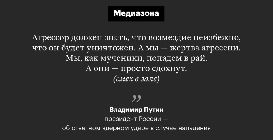 Президент России Владимир Путин заявил, что в случае ядерной войны, россияне как мученики попадут в рай.