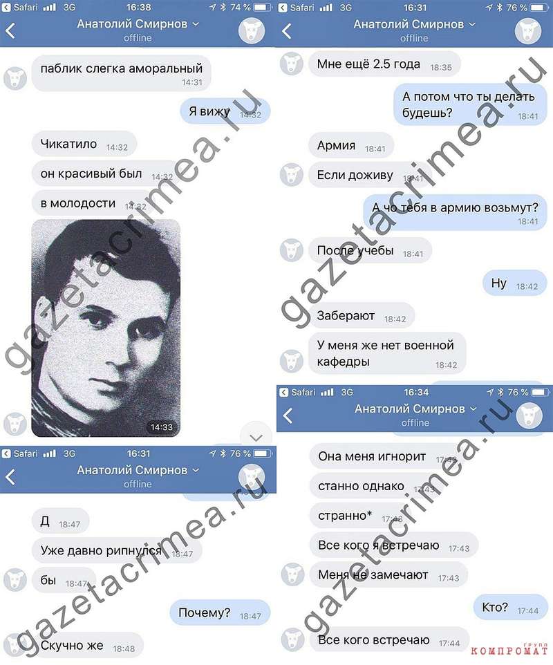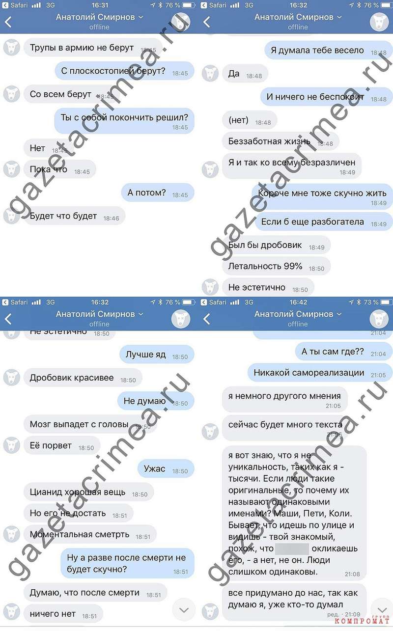 В переписке Росляков говорит, что ему нравится паблик про маньяков, что он не видит смысла в жизни и давно «рипнулся бы» ‒ «скучно же». Студент обсуждал с девушкой, имя которой осталось неизвестно, как лучше покончить с собой. Дробовик эффективно, но не эстетично, цианид быстро, но неизвестно, где его достать, рассуждал Росляков.