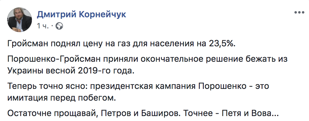 "Порошенко-Гройсман приняли окончательное решение бежать из Украины весной 2019-го года. Теперь точно ясно: президентская кампания Порошенко - это имитация перед побегом. Остаточне прощавай, Петров и Баширов. Точнее - Петя и Вова...", - написал политолог.