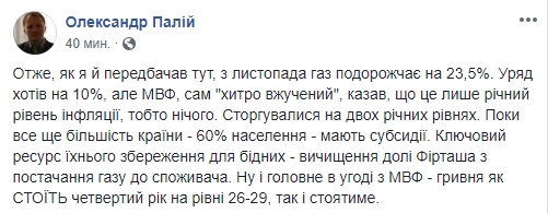 Политолог Александр Палий также высказался в позитивном ключе: "Итак, как я и предполагал, с ноября газ подорожает на 23,5%. Правительство хотело на 10%, но МВФ, сам "хитро вжученый", говорил, что это лишь годовой уровень инфляции, то есть ничего. Сторговались на двух годовых уровнях. Пока все еще большинство страны - 60% населения - имеют субсидии. Ключевой ресурс их сохранения для бедных - вычищение доли Фирташа из поставок газа к потребителю. Ну и главное в соглашении с МВФ - гривна как СТОИТ четвертый год на уровне 26-29, так и будет стоять".