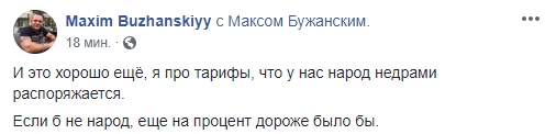 Впрочем, большинство реакций были негативные. Блогер Макс Бужанский напомнил, что возросший в цене газ вообще-то добывают из недр, которые принадлежат народу: "И это хорошо ещё, я про тарифы, что у нас народ недрами распоряжается. Если б не народ, еще на процент дороже было бы", - иронизирует блогер.