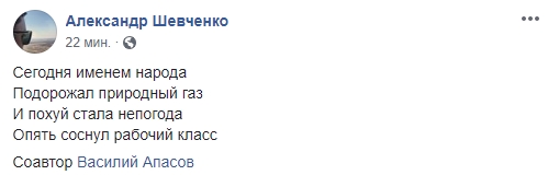Блогер Александр Шевченко вместе с журналистом Василием Апасовым сочиняет стихи на злобу дня: "Сегодня именем народа Подорожал природный газ, И по**й стала непогода, Опять соснул рабочий класс".