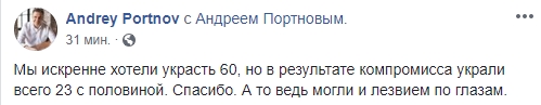 Известный юрист Андрей Портнов иронизирует над формулировками Гройсмана: "Мы искренне хотели украсть 60, но в результате компромисса украли всего 23 с половиной. Спасибо. А то ведь могли и лезвием по глазам".