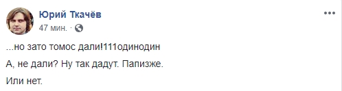 Тему Томоса развивает и журналист Юрий Ткачев: "...Но зато томос дали! Один-один. А, не дали? Ну так дадут. Папизже. Или нет".