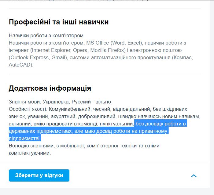 Не отстают от работодателей и те, кто ищут работу. Например, 25-летний Богдан из Киева разместил резюме на сайте бесплатных объявлений. Химик-технолог по образованию, он ищет работу продавца-консультанта. Перечислив свои навыки, соискатель добавил: «Без опыта работы на государственных предприятиях, но имею опыт работы на частном предприятии».