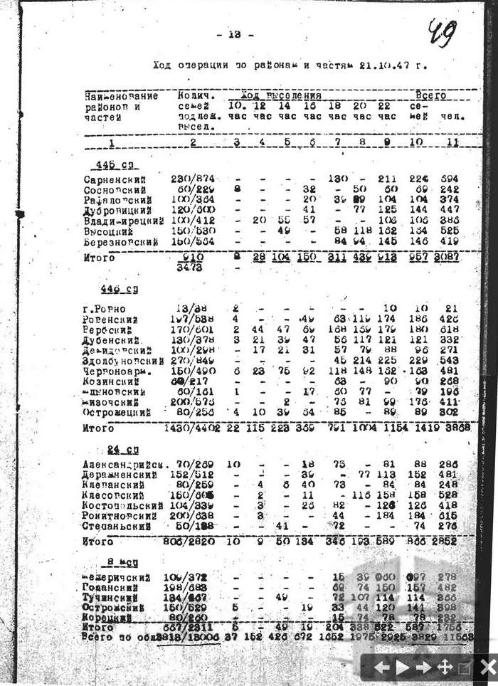 Выдержка из итогового отчёта о проведении операции "Запад" в Ровенской области, здесь ход укрепления "дружбы народов" расписан буквально по часам — насколько именно дружба укрепилась в 10, 12, 14 и 16 часов в день 21 октября 1947 года: