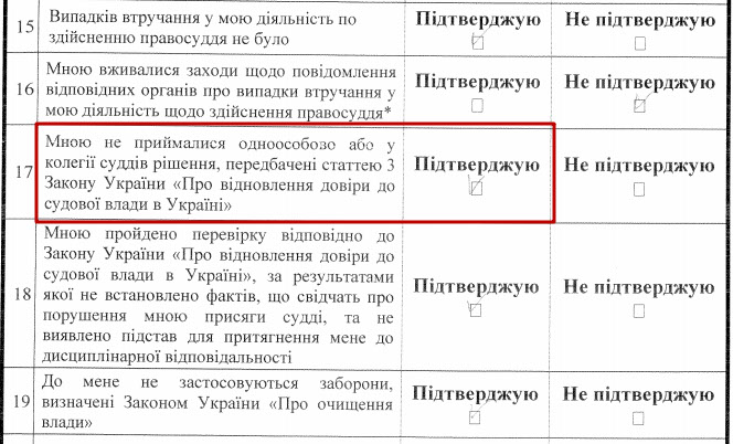 Як відомо, кожен суддя мав вказати у Декларації доброчесності, чи виносив він рішення щодо учасників акцій протестів, що підпадають під дію Закону «Про відновлення довіри до судової влади в Україні».