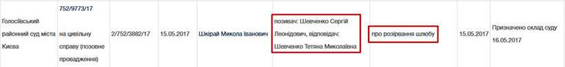 До речі, Сергій Шевченко подавав заяву про розірвання шлюбу із Тетяною Миколаївною. У 2017 році він звернувся в Голосіївський суд з відповідним позовом. Справу передали до Дарницького суду, але позивач жодного разу не з’явився на виклик і позов був залишений без розгляду.